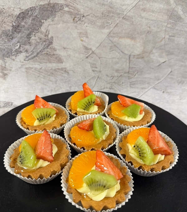 Kruchy spód z kremem budyniowo waniliowym i sezonowymi owocami.
