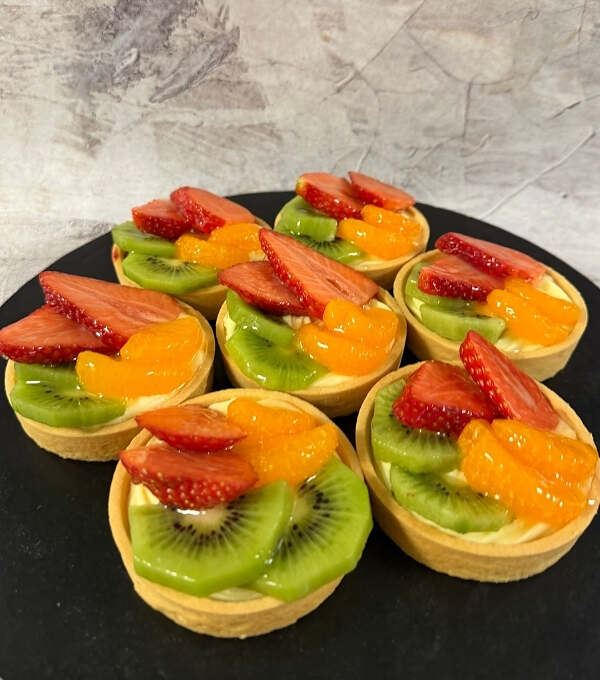 Kruchy spód z kremem budyniowo waniliowym i sezonowymi owocami.