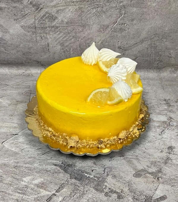 Jasny biszkopt, delikatny krem cytrynowy, puszysta śmietanka cytrynowa, tort oblany żelem cytrynowym.